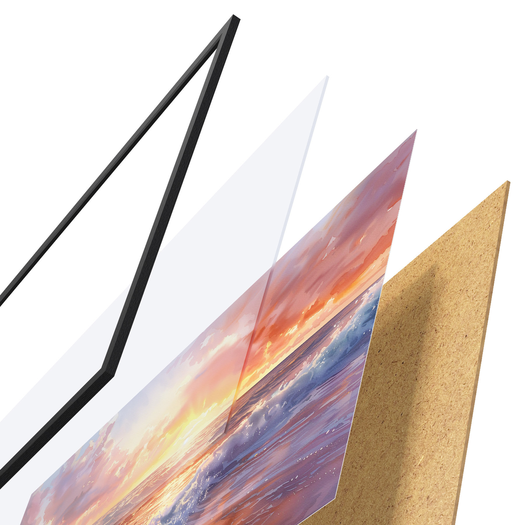 De poster bestaat uit een frame, plexiglas, geprinte afbeelding en spaanplaat achterkant. De poster kan meteen aan de muur worden gehangen dankzij de bevestigingen op de achterkant.