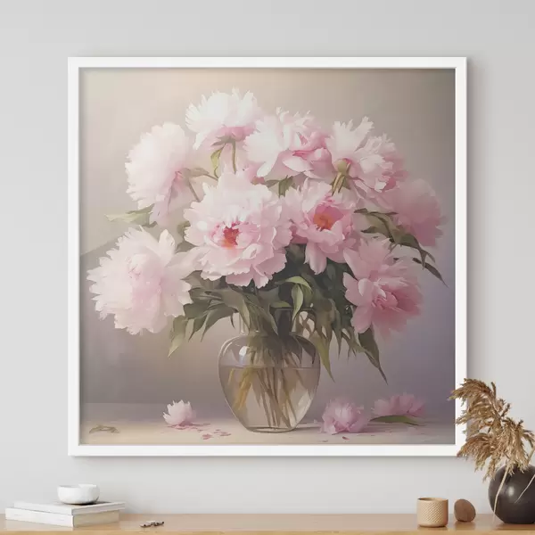 Poster Roze pioenrozen in een glazen vaas op een zwarte achtergrond, imitatie van een olieverfschilderij, bloemen f38482