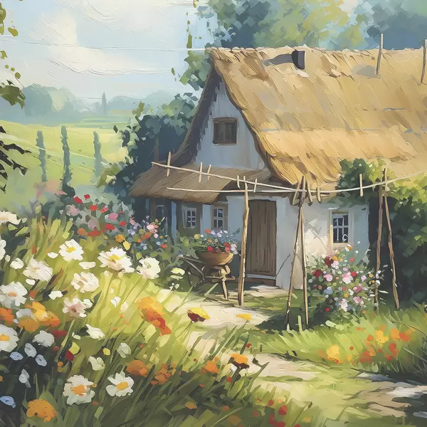 Poster Dorpshuis met tuin, zomerbloemen, olieverf, penseelstreken, veld, rustieke stijl f38491