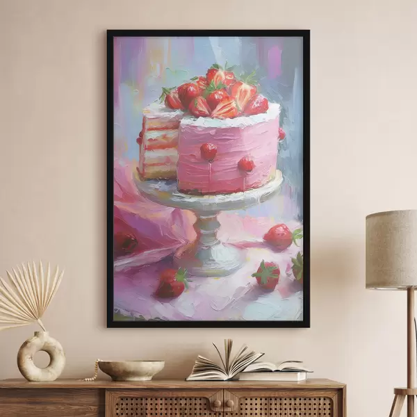 Poster Aardbeientaart met room, olieverf, grote penseelstreken, zomerbessen, roze kleuren Nr f38499
