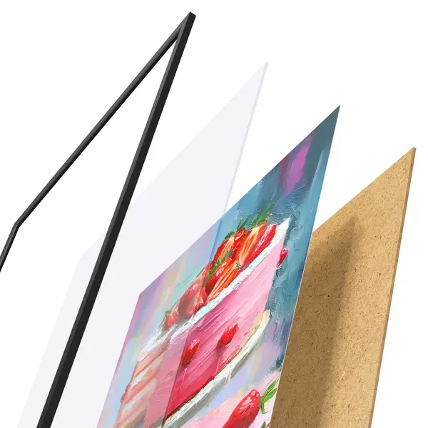 De poster bestaat uit een frame, plexiglas, geprinte afbeelding en spaanplaat achterkant. De poster kan meteen aan de muur worden gehangen dankzij de bevestigingen op de achterkant.