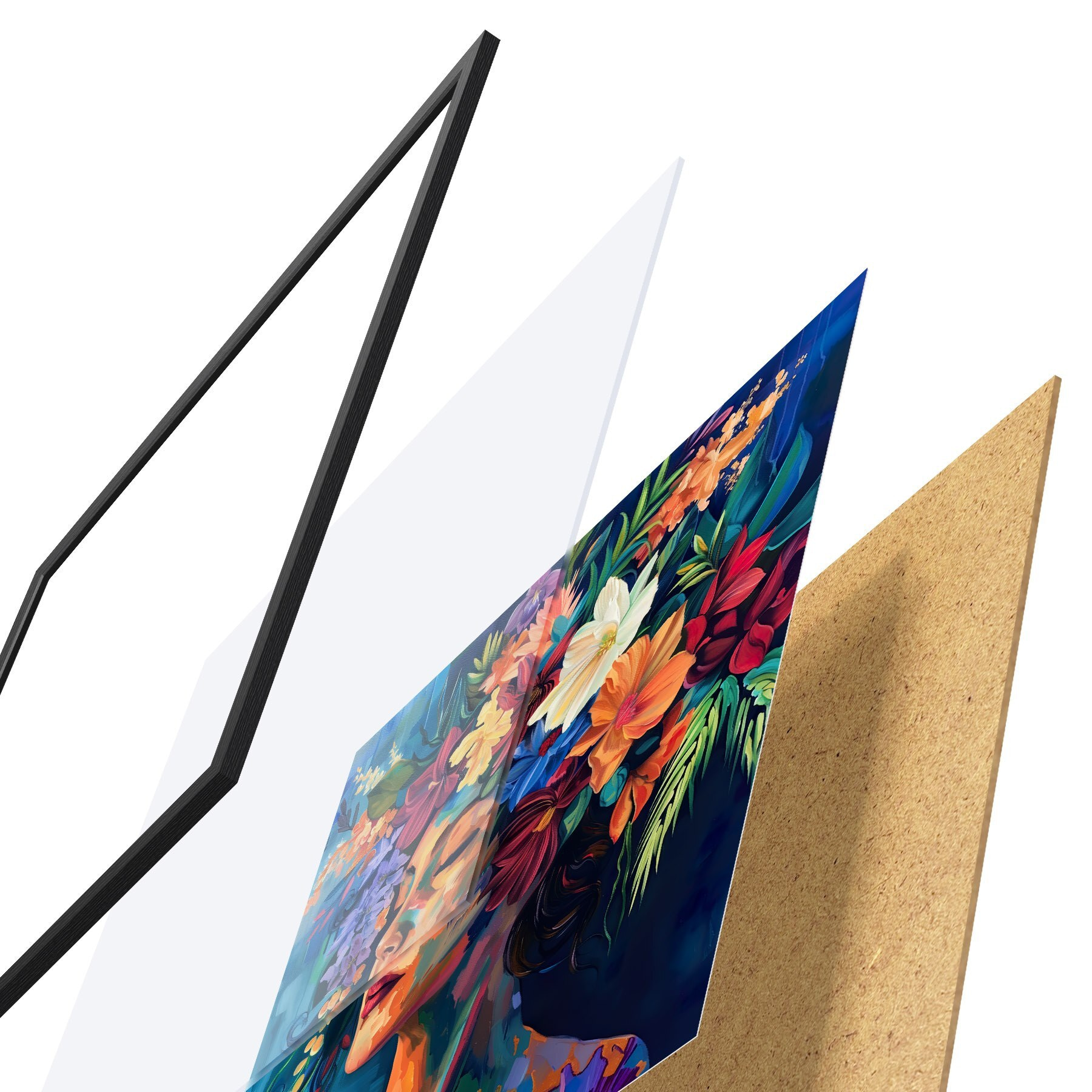 De poster bestaat uit een frame, plexiglas, geprinte afbeelding en spaanplaat achterkant. De poster kan meteen aan de muur worden gehangen dankzij de bevestigingen op de achterkant.