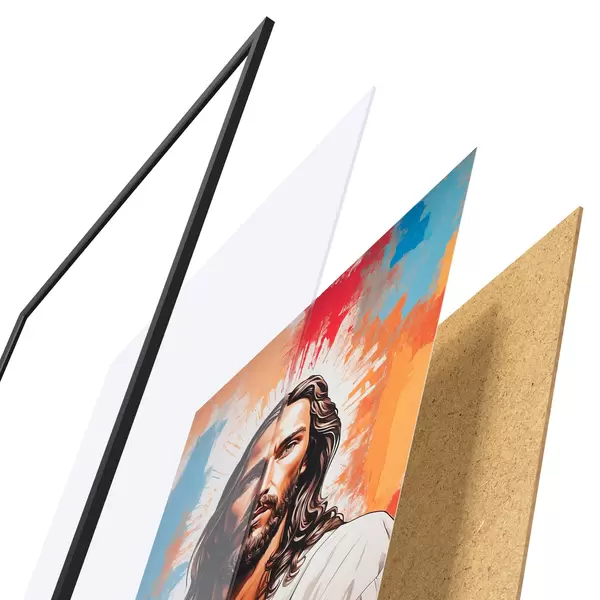 De poster bestaat uit een frame, plexiglas, geprinte afbeelding en spaanplaat achterkant. De poster kan meteen aan de muur worden gehangen dankzij de bevestigingen op de achterkant.