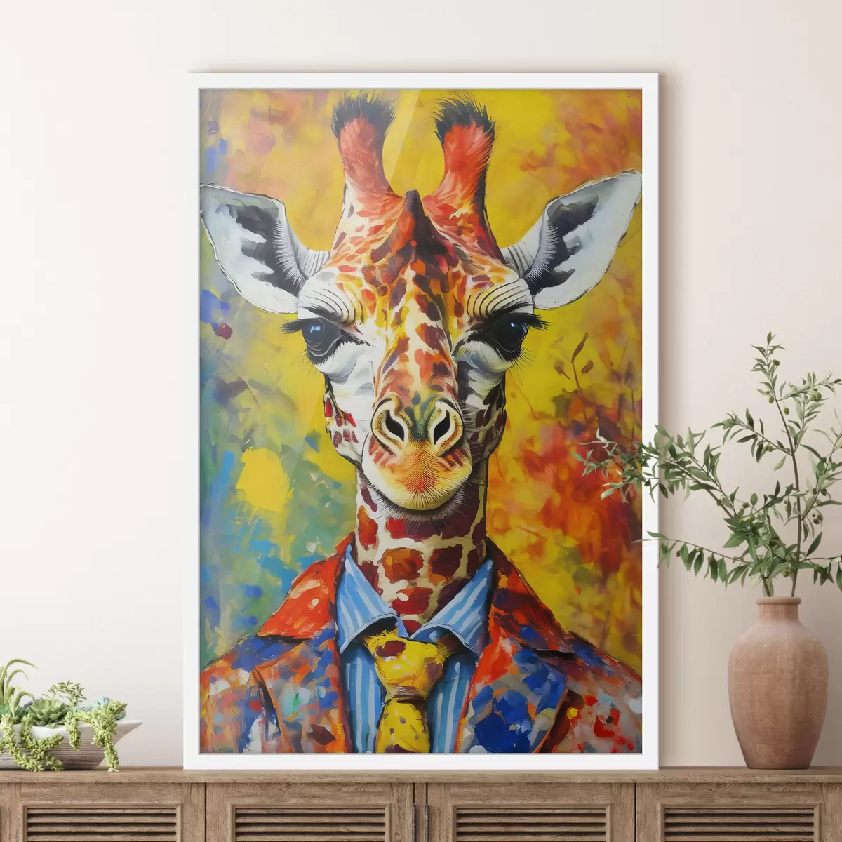 Poster portret van een giraffe in een pak op een gele achtergrond Nr f38606