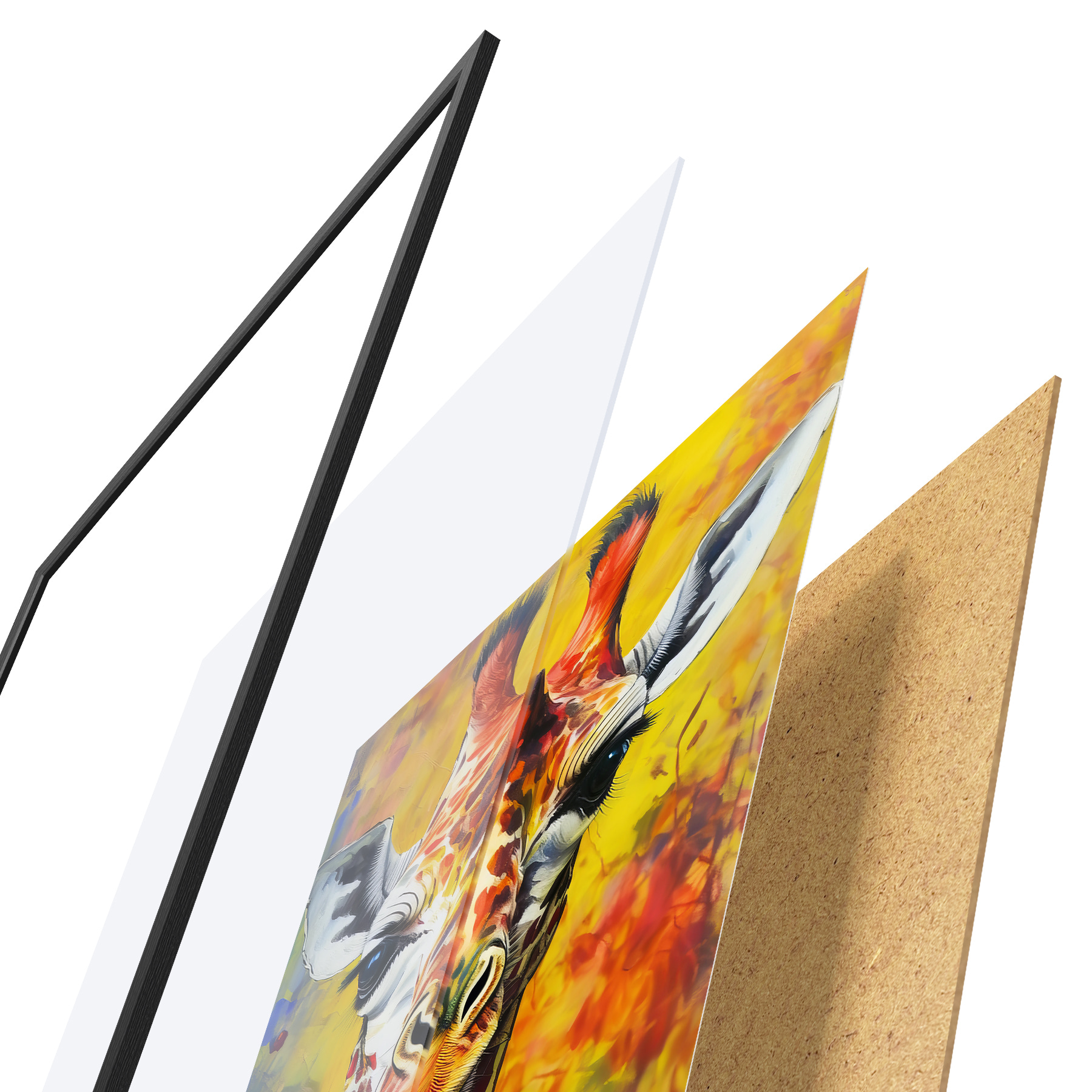 De poster bestaat uit een frame, plexiglas, geprinte afbeelding en spaanplaat achterkant. De poster kan meteen aan de muur worden gehangen dankzij de bevestigingen op de achterkant.