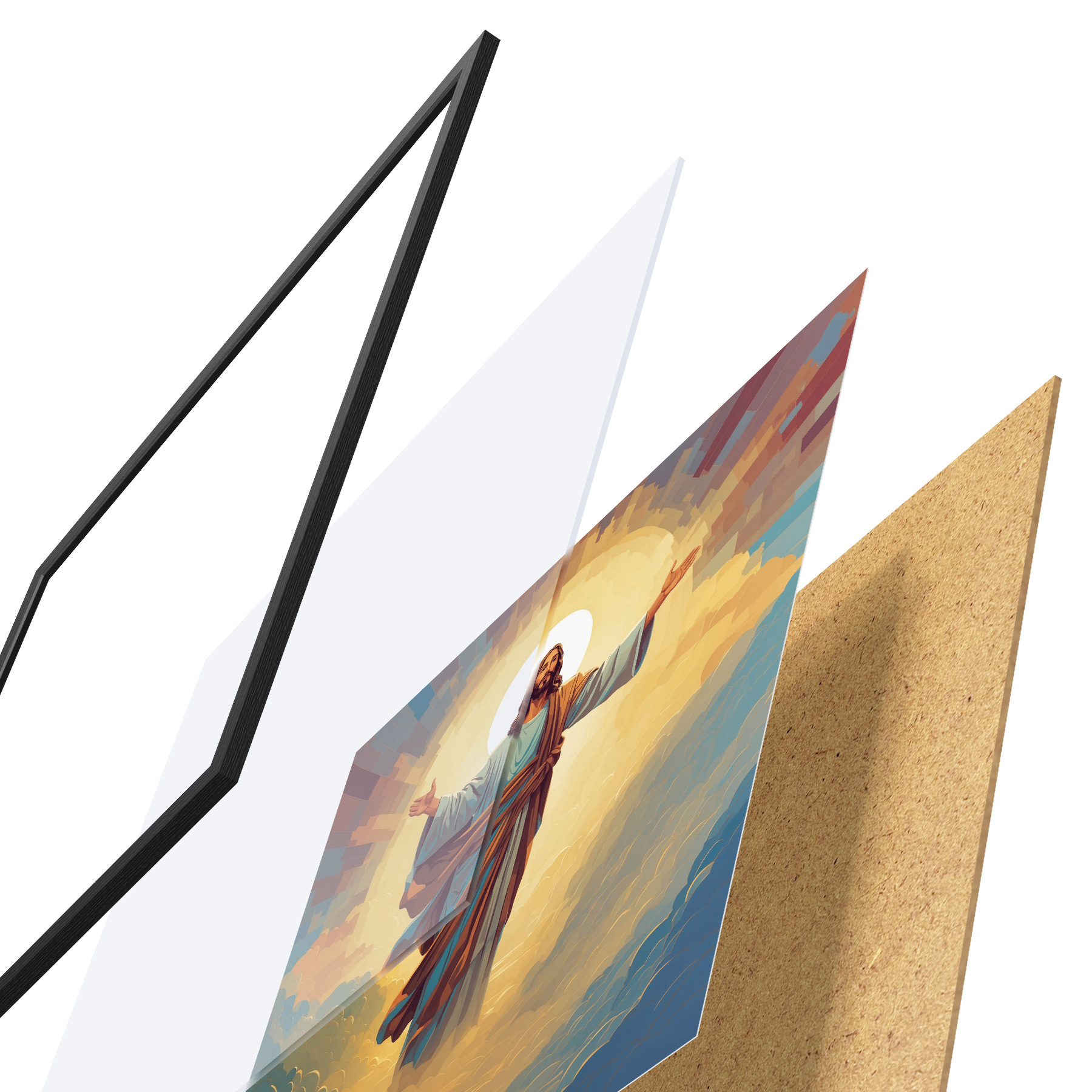 De poster bestaat uit een frame, plexiglas, geprinte afbeelding en spaanplaat achterkant. De poster kan meteen aan de muur worden gehangen dankzij de bevestigingen op de achterkant.