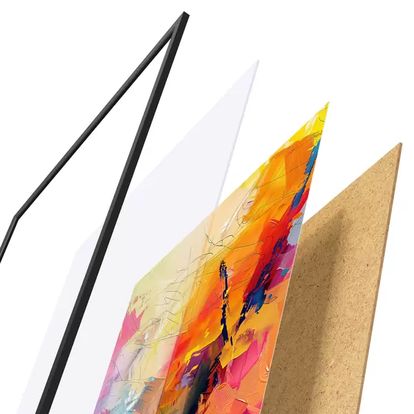 De poster bestaat uit een frame, plexiglas, geprinte afbeelding en spaanplaat achterkant. De poster kan meteen aan de muur worden gehangen dankzij de bevestigingen op de achterkant.