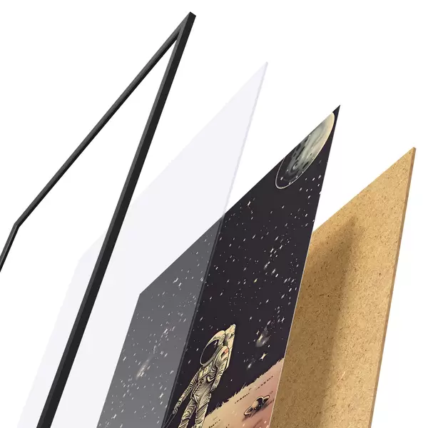 De poster bestaat uit een frame, plexiglas, geprinte afbeelding en spaanplaat achterkant. De poster kan meteen aan de muur worden gehangen dankzij de bevestigingen op de achterkant.