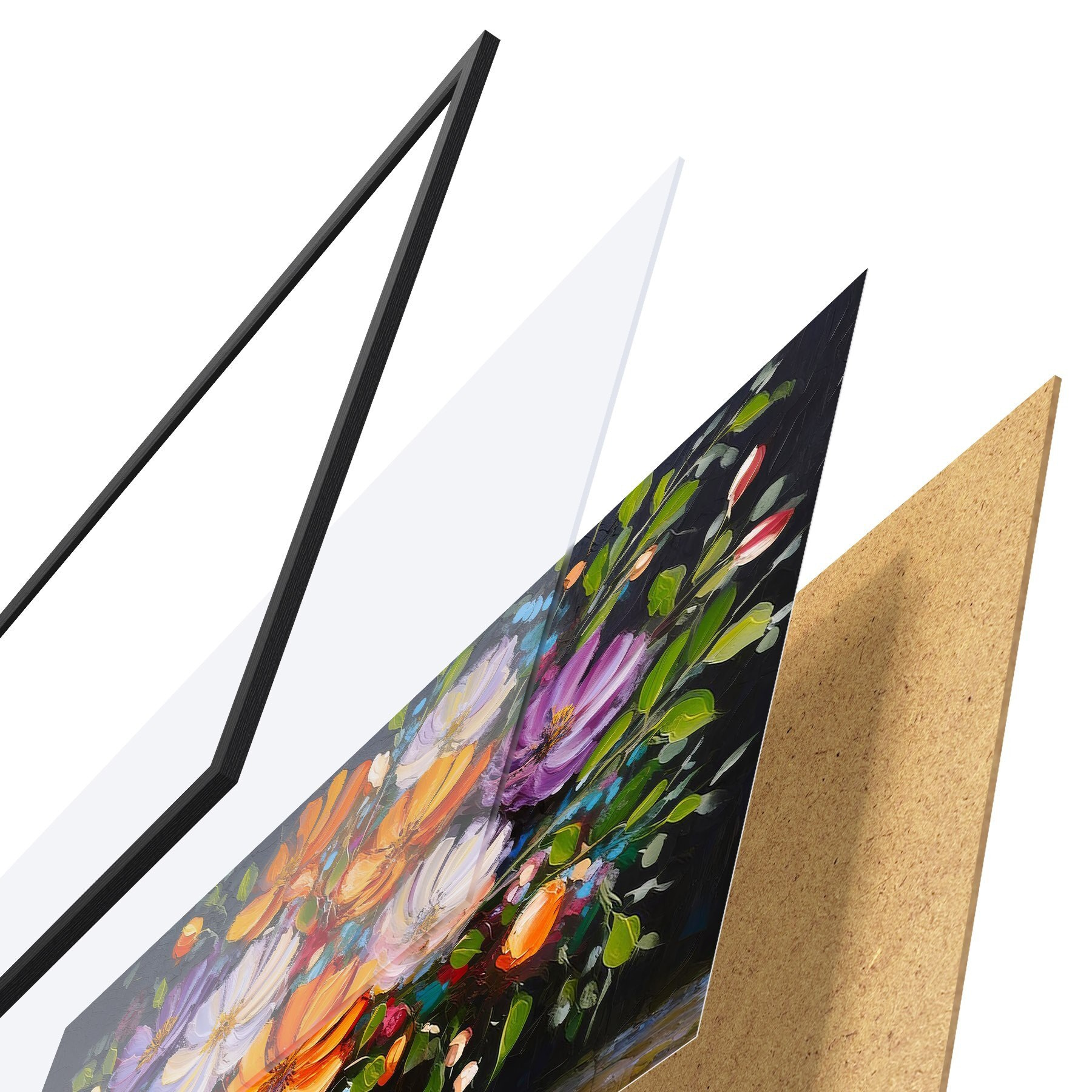 De poster bestaat uit een frame, plexiglas, geprinte afbeelding en spaanplaat achterkant. De poster kan meteen aan de muur worden gehangen dankzij de bevestigingen op de achterkant.