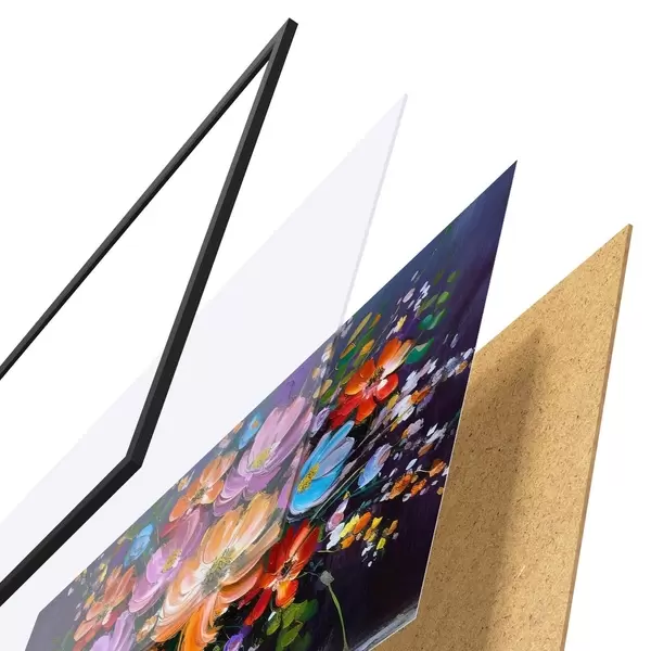 De poster bestaat uit een frame, plexiglas, geprinte afbeelding en spaanplaat achterkant. De poster kan meteen aan de muur worden gehangen dankzij de bevestigingen op de achterkant.