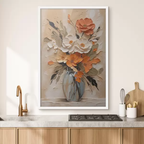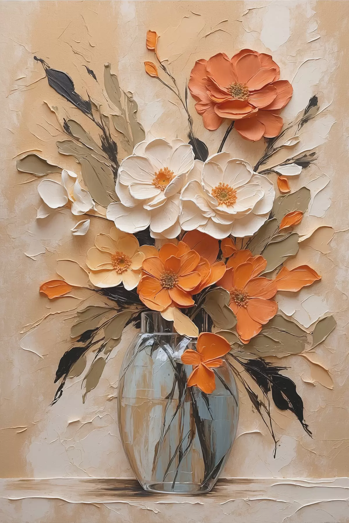 Poster Bloemen in vaas in olieverf op beige achtergrond Nr f38673