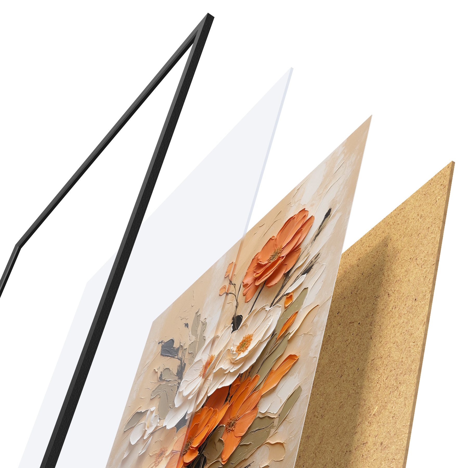 De poster bestaat uit een frame, plexiglas, geprinte afbeelding en spaanplaat achterkant. De poster kan meteen aan de muur worden gehangen dankzij de bevestigingen op de achterkant.