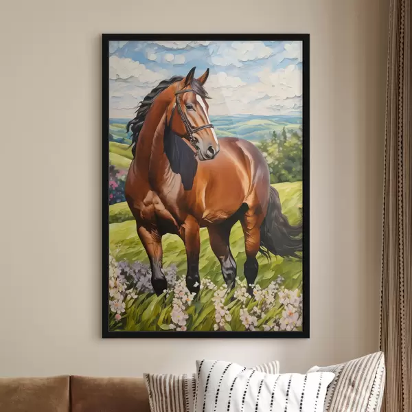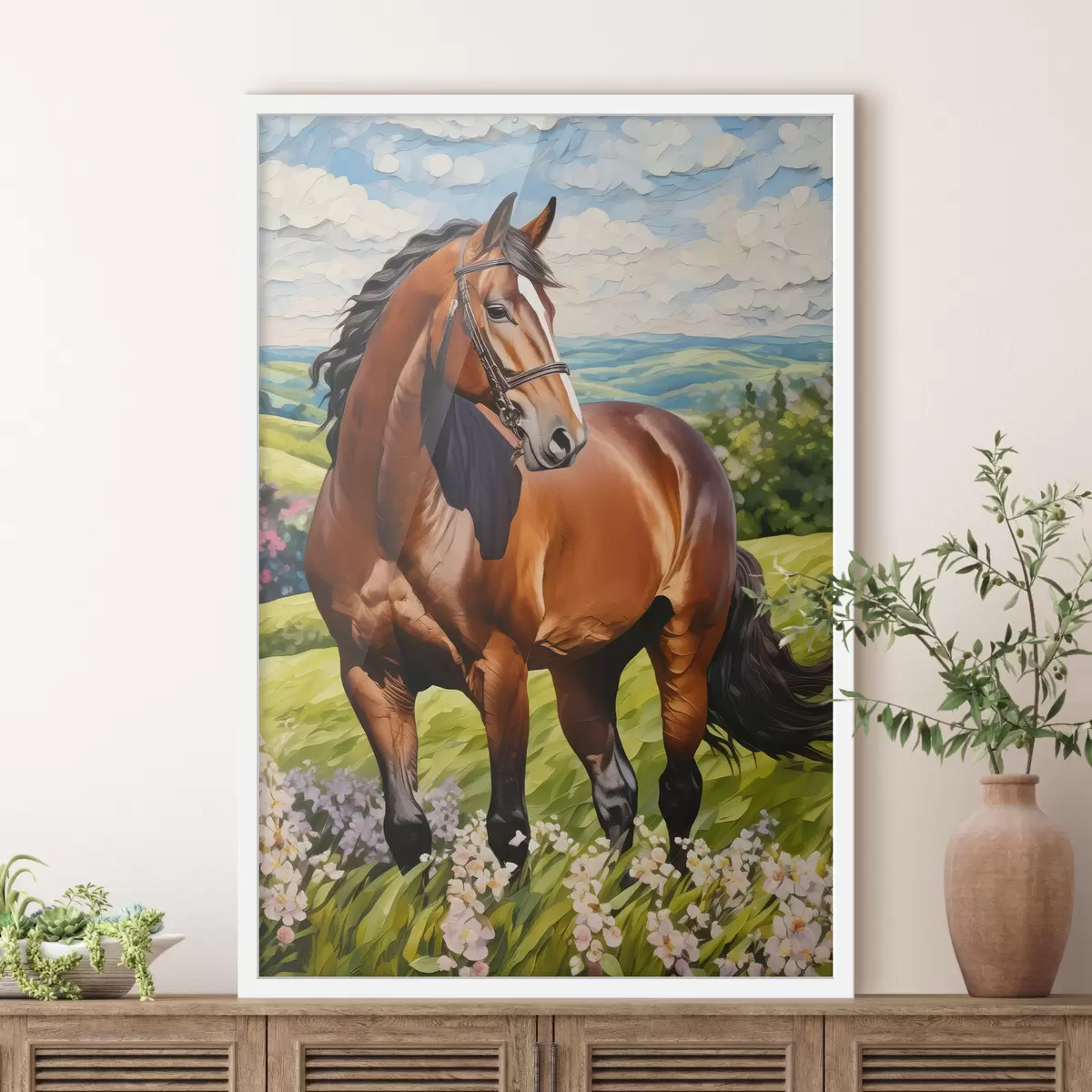 Poster Mooi paard op het gazon, blauwe lucht Nr f38727