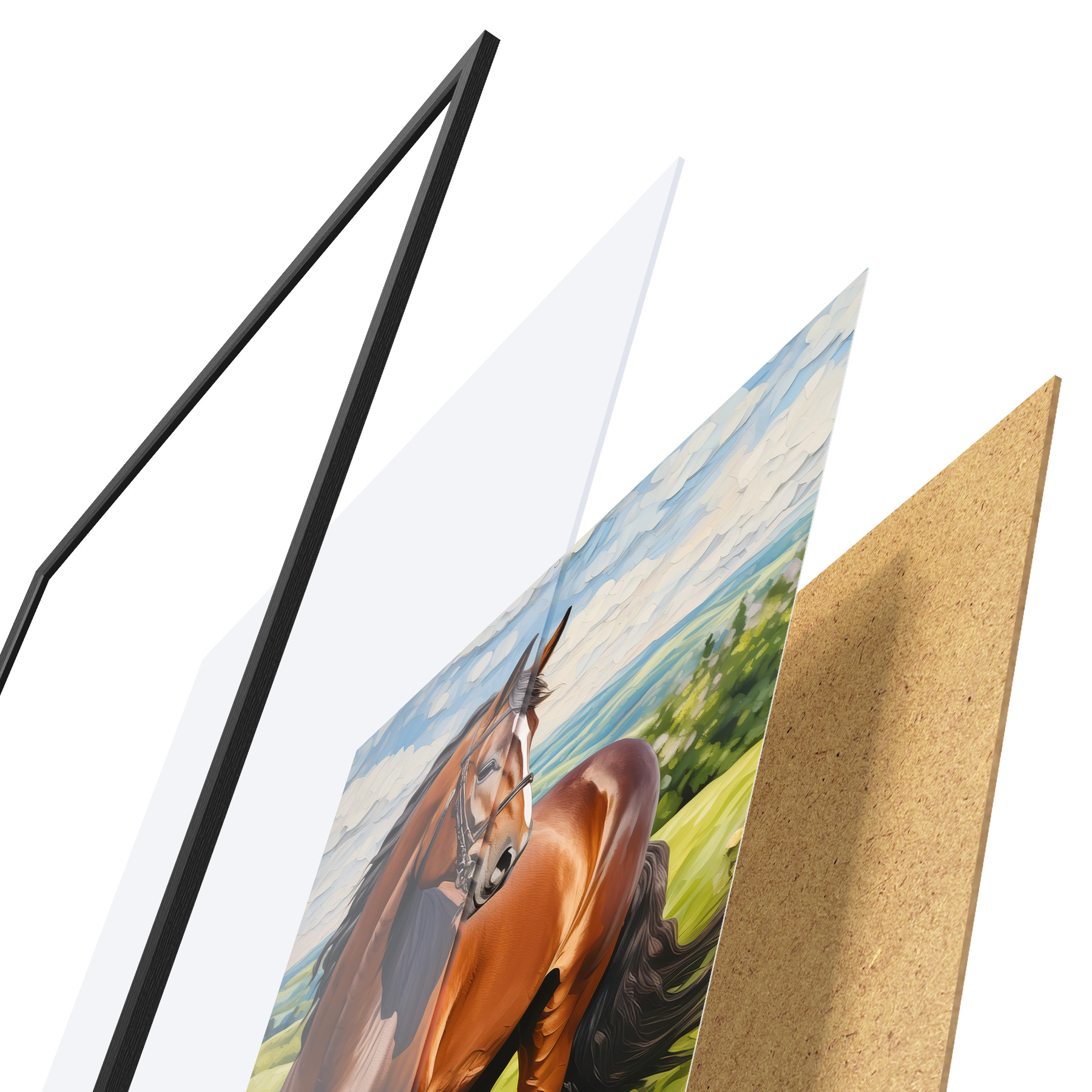 De poster bestaat uit een frame, plexiglas, geprinte afbeelding en spaanplaat achterkant. De poster kan meteen aan de muur worden gehangen dankzij de bevestigingen op de achterkant.