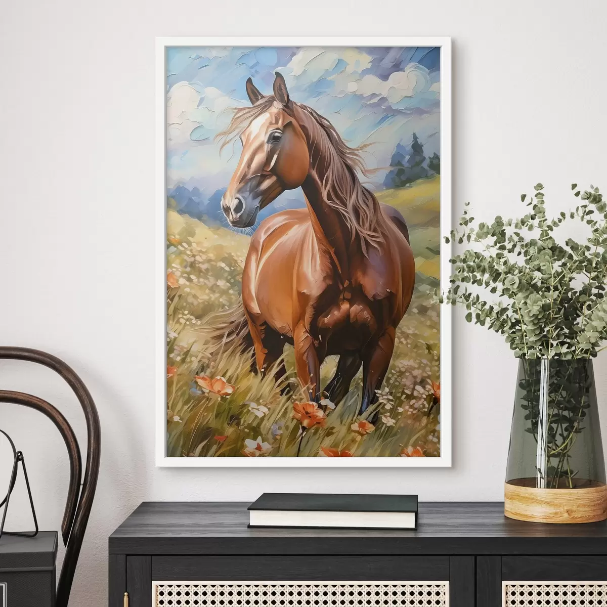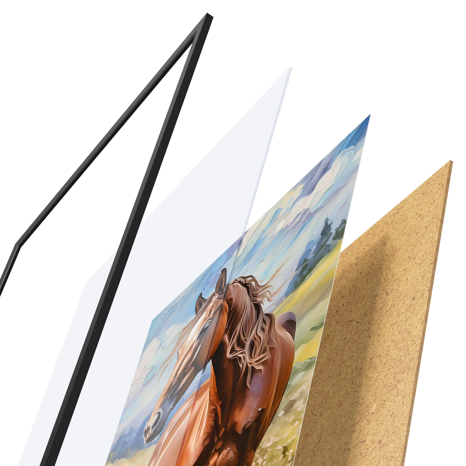 De poster bestaat uit een frame, plexiglas, geprinte afbeelding en spaanplaat achterkant. De poster kan meteen aan de muur worden gehangen dankzij de bevestigingen op de achterkant.