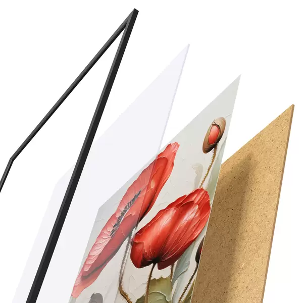 De poster bestaat uit een frame, plexiglas, geprinte afbeelding en spaanplaat achterkant. De poster kan meteen aan de muur worden gehangen dankzij de bevestigingen op de achterkant.