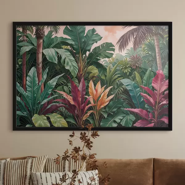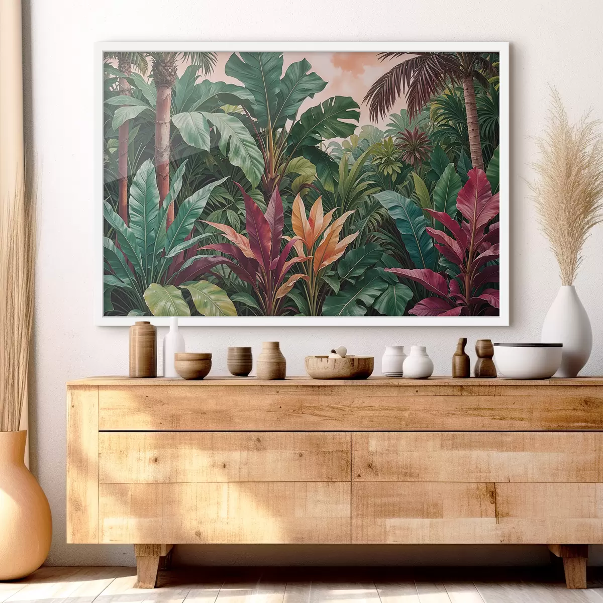 Poster Een weelderige, tropische jungle met levendige groene bladeren, palmbladeren en kleurrijke bloemen Nr f38817