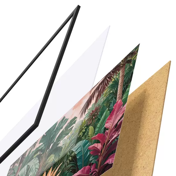 De poster bestaat uit een frame, plexiglas, geprinte afbeelding en spaanplaat achterkant. De poster kan meteen aan de muur worden gehangen dankzij de bevestigingen op de achterkant.