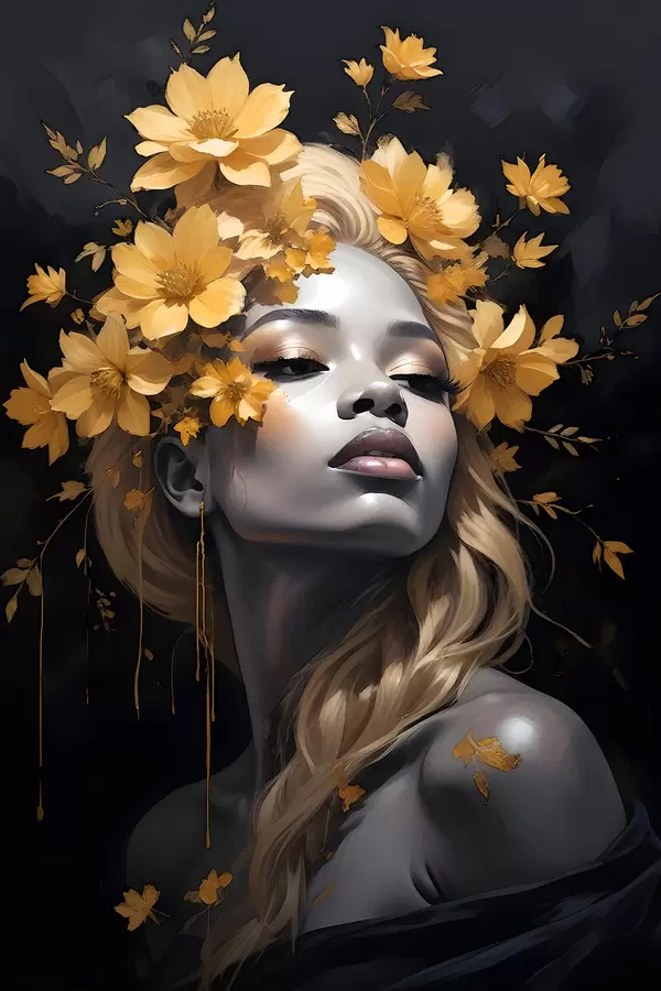 Poster Een portret van een jonge vrouw omringd door geel herfstbladeren tegen een donkere achtergrond Nr f38834