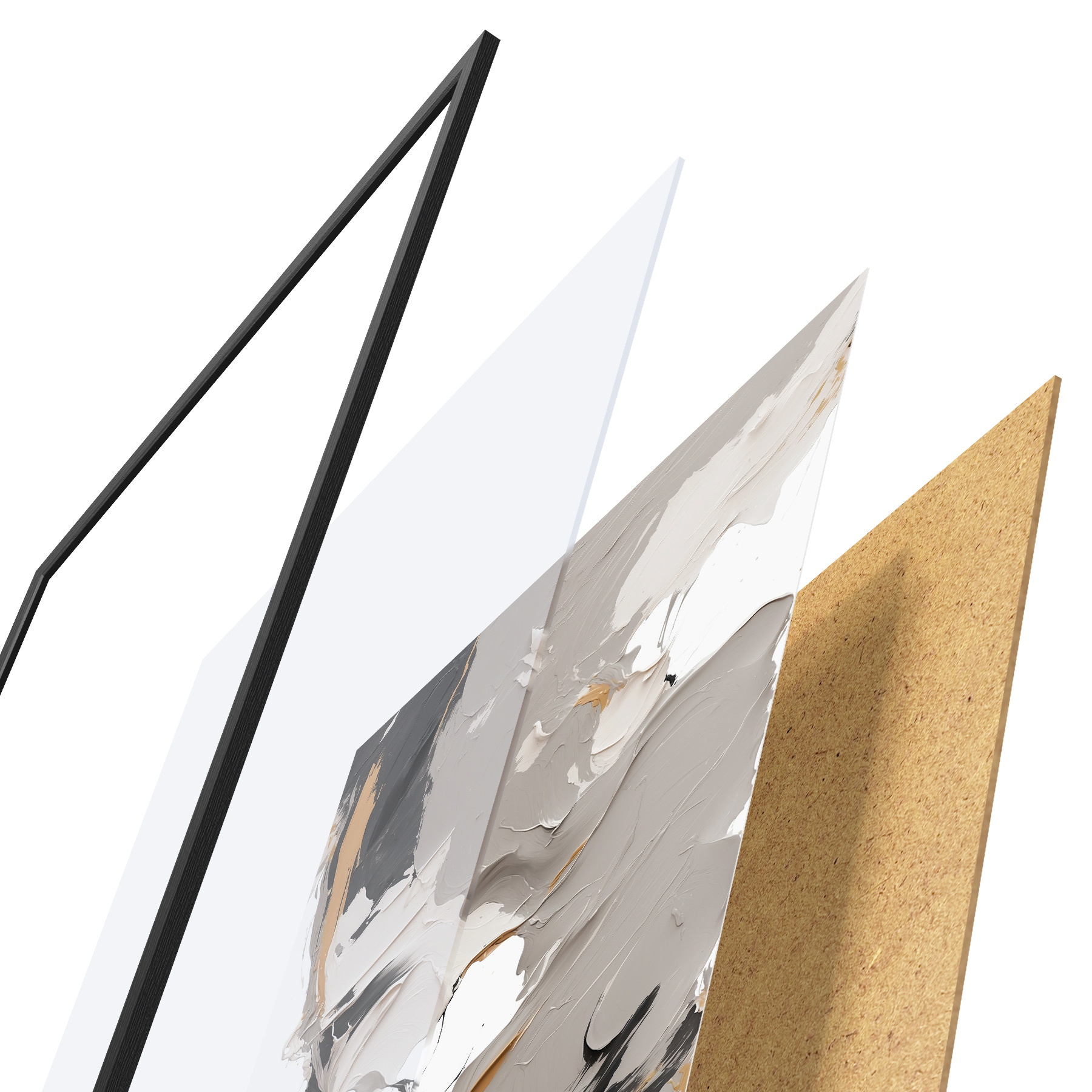 De poster bestaat uit een frame, plexiglas, geprinte afbeelding en spaanplaat achterkant. De poster kan meteen aan de muur worden gehangen dankzij de bevestigingen op de achterkant.
