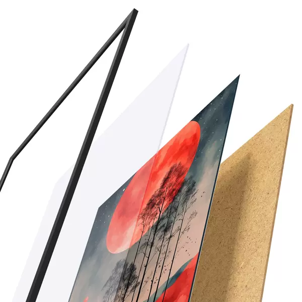 De poster bestaat uit een frame, plexiglas, geprinte afbeelding en spaanplaat achterkant. De poster kan meteen aan de muur worden gehangen dankzij de bevestigingen op de achterkant.