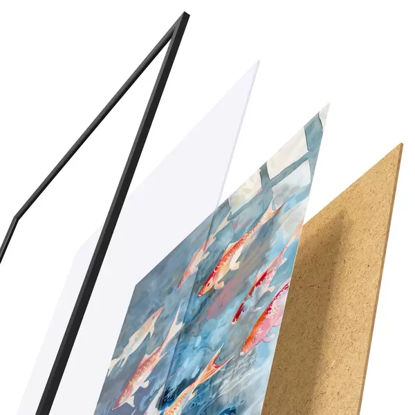 De poster bestaat uit een frame, plexiglas, geprinte afbeelding en spaanplaat achterkant. De poster kan meteen aan de muur worden gehangen dankzij de bevestigingen op de achterkant.