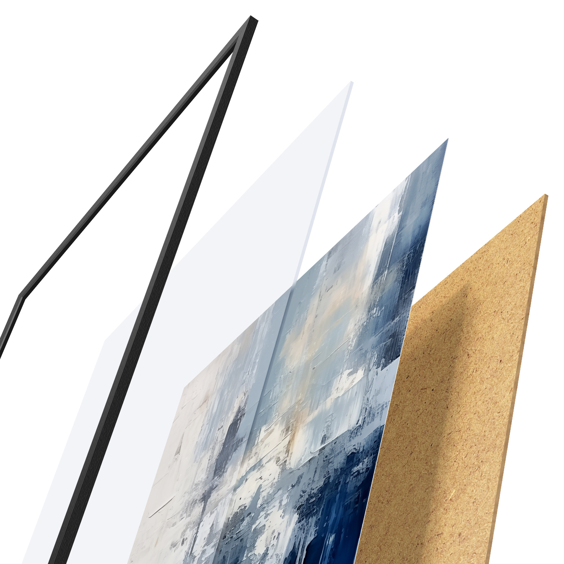 De poster bestaat uit een frame, plexiglas, geprinte afbeelding en spaanplaat achterkant. De poster kan meteen aan de muur worden gehangen dankzij de bevestigingen op de achterkant.