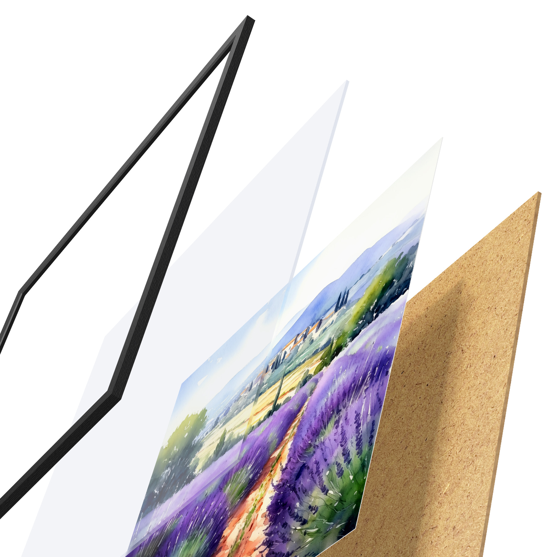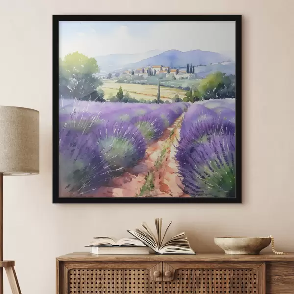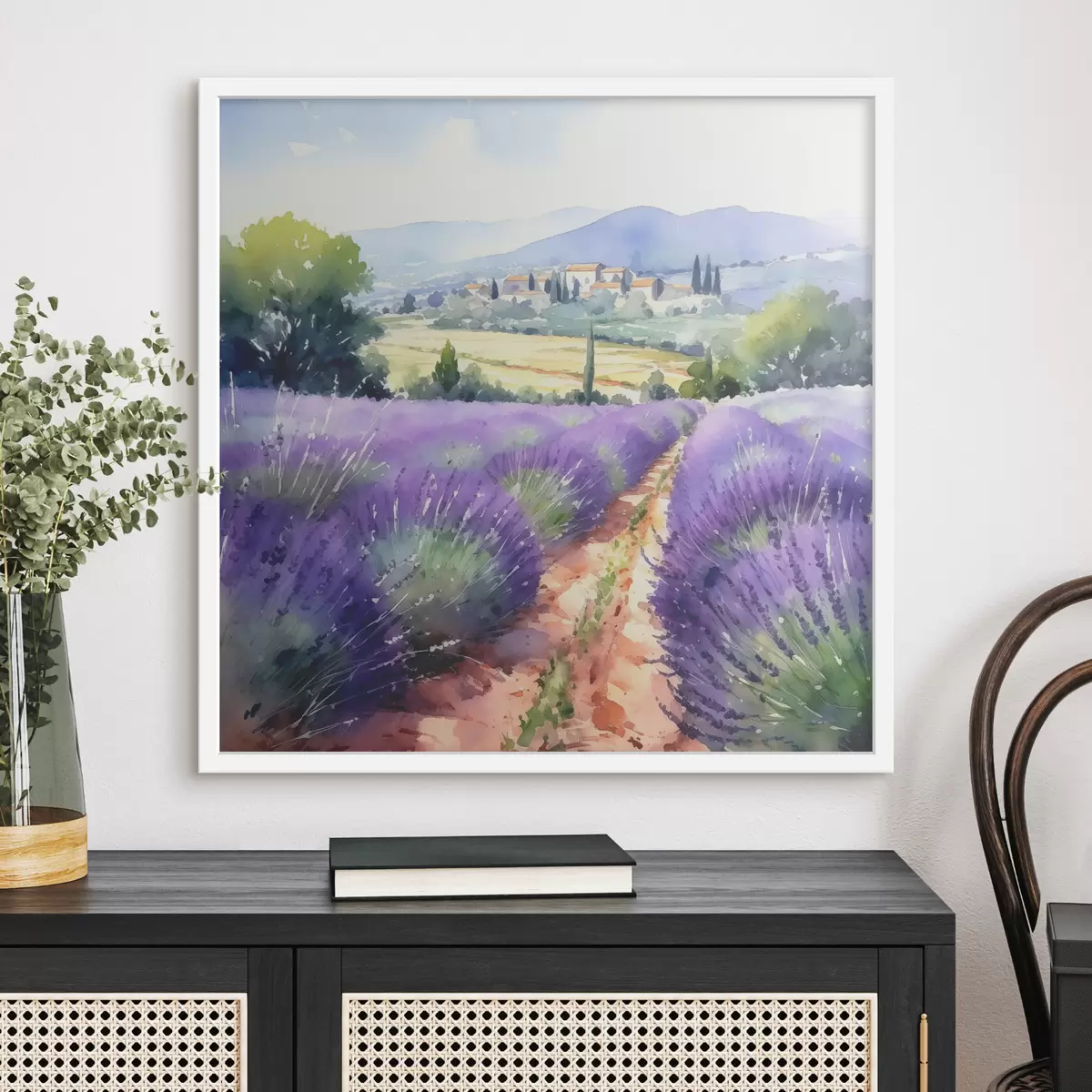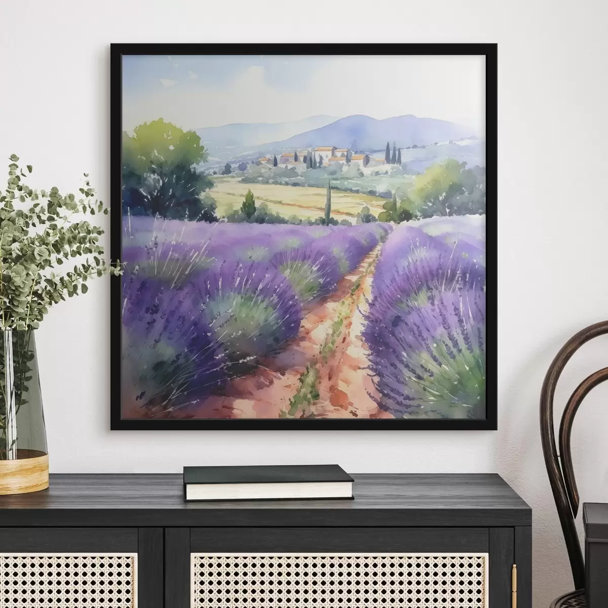 Poster Aquarel lavendelveld tegen de achtergrond van bergen en platteland f38913
