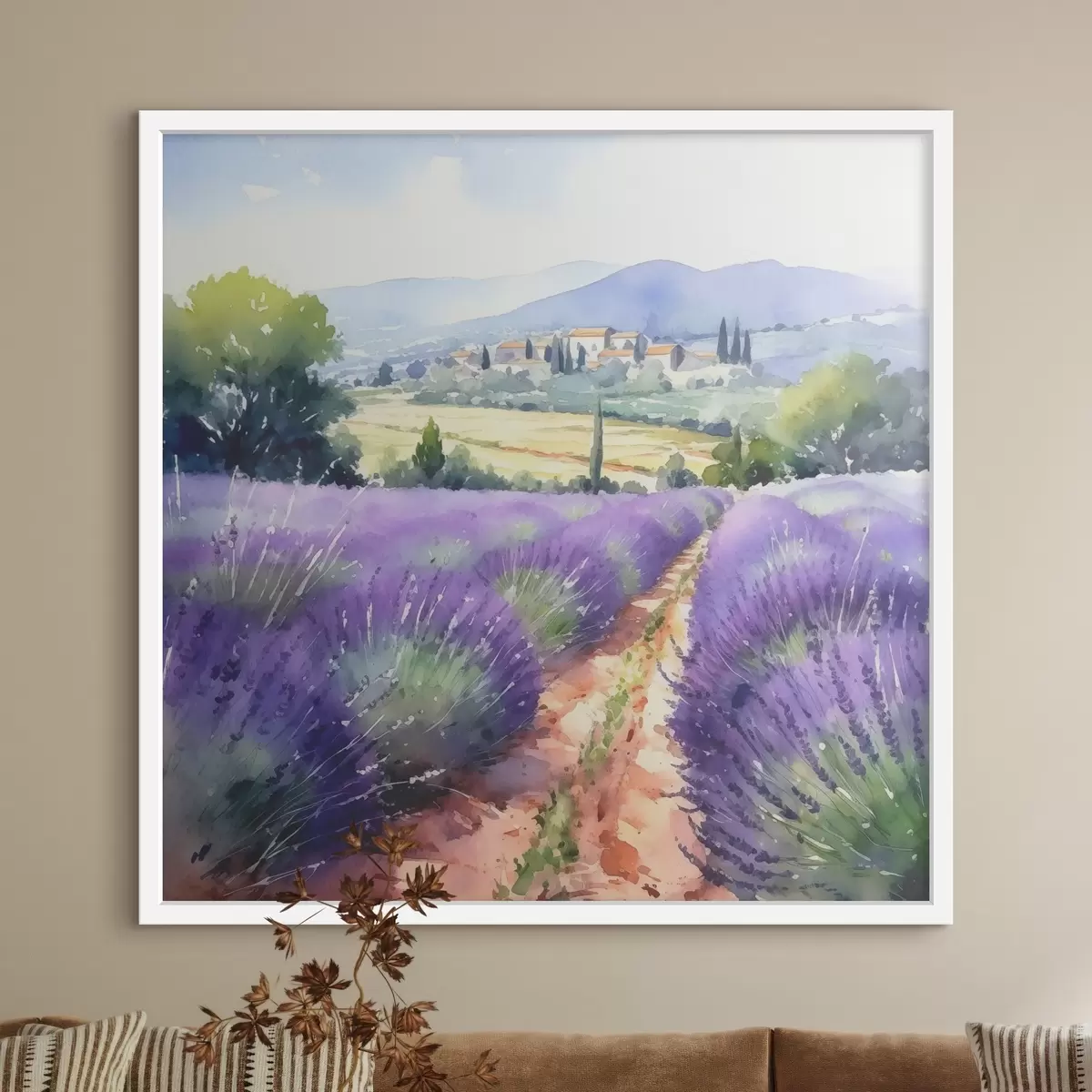 Poster Aquarel lavendelveld tegen de achtergrond van bergen en platteland Nr f38913
