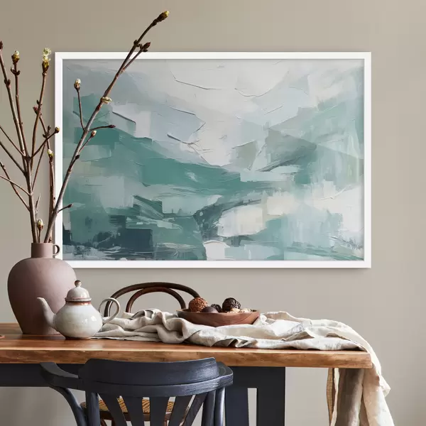 Poster Abstractie van blauwe en witte grote lijnen, imitatie van olieverfschilderij, minimalisme f38915