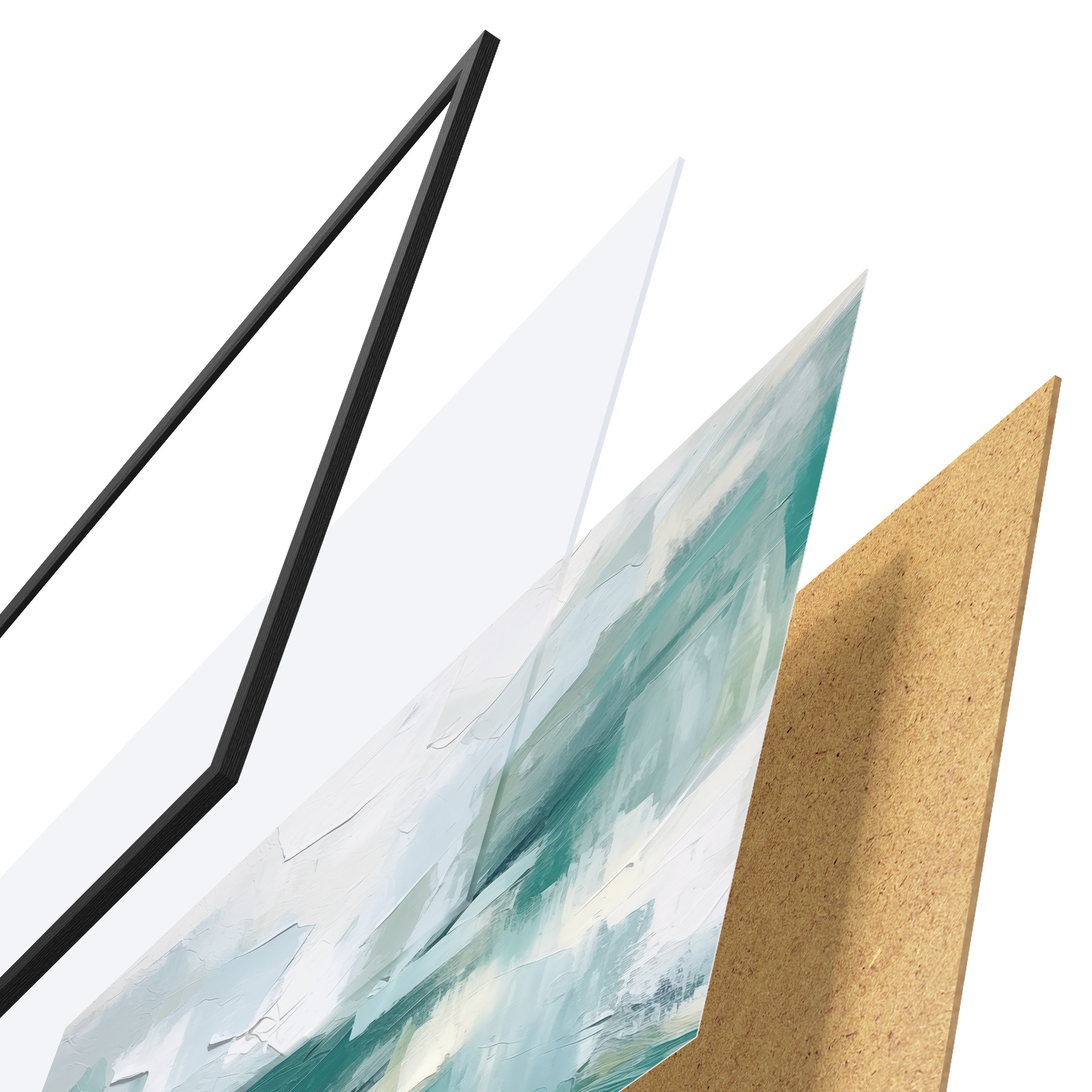 De poster bestaat uit een frame, plexiglas, geprinte afbeelding en spaanplaat achterkant. De poster kan meteen aan de muur worden gehangen dankzij de bevestigingen op de achterkant.