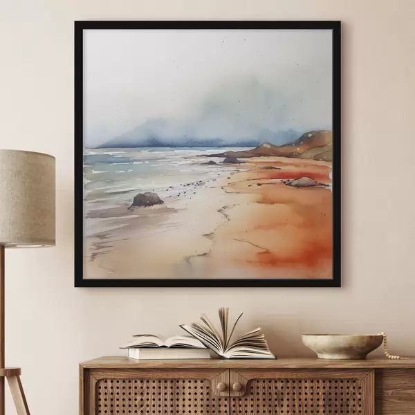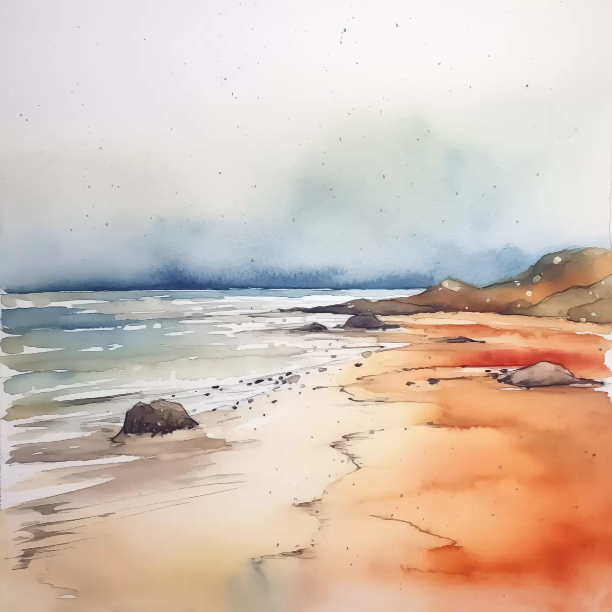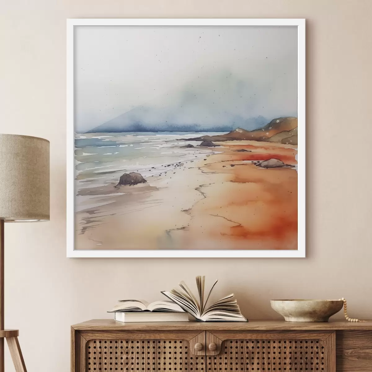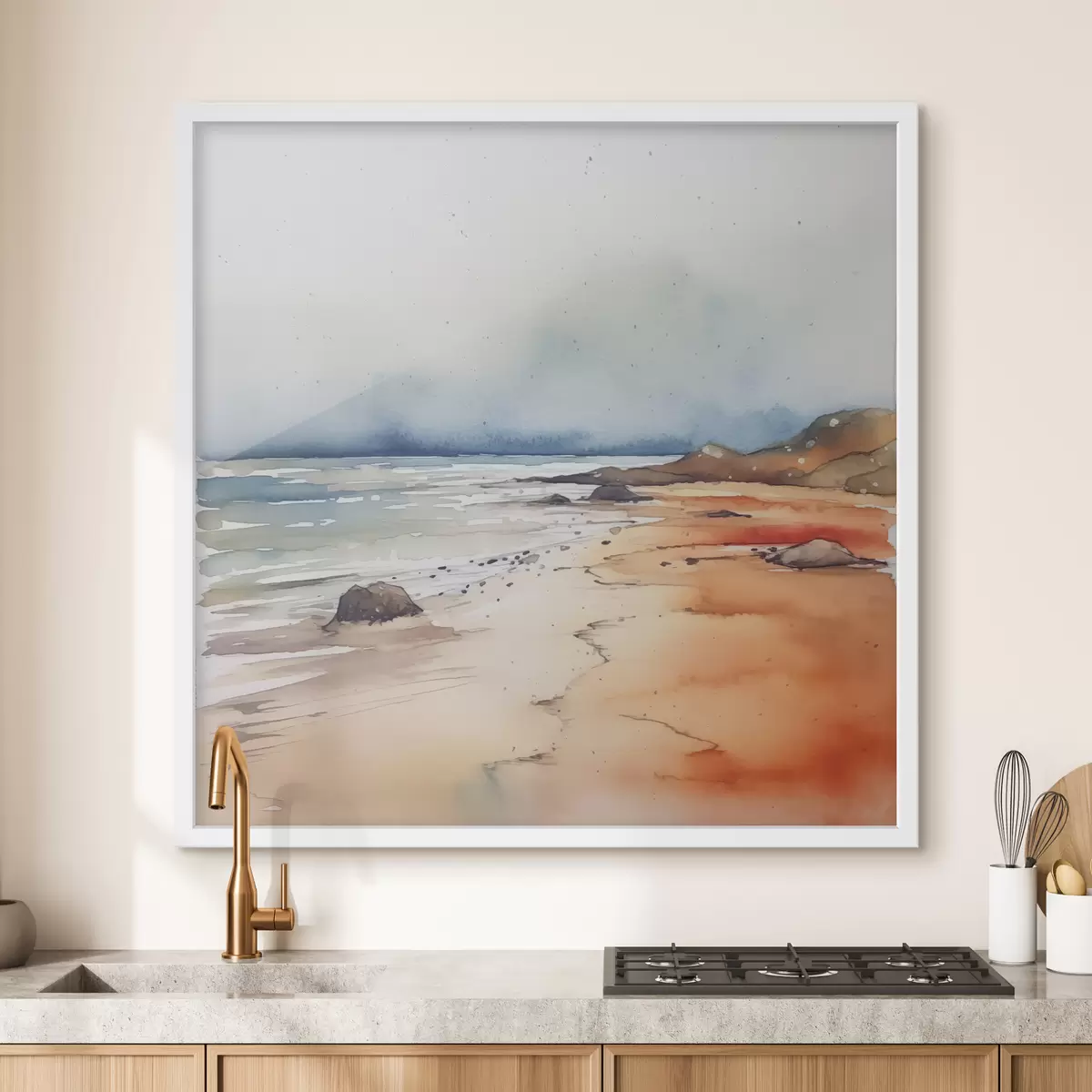 Poster Zee en strand, regen, aquarel, vlekken, landschap, landschap, blauw, oranje kleur Nr f38936
