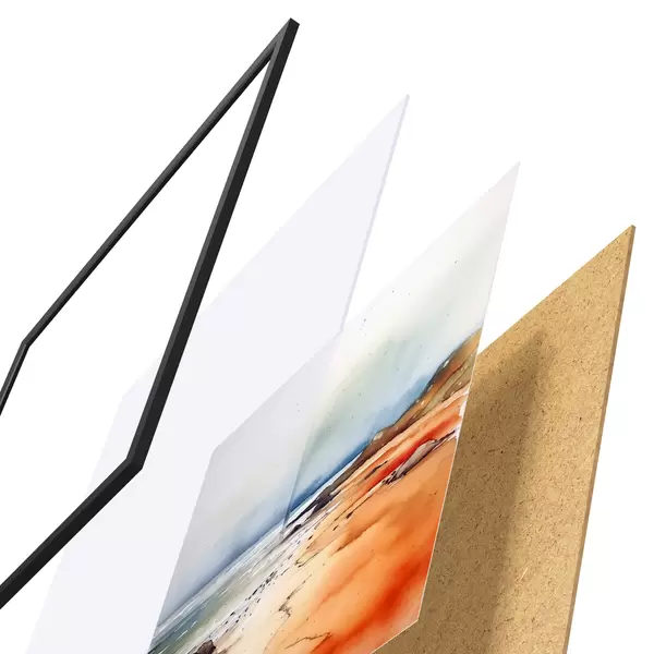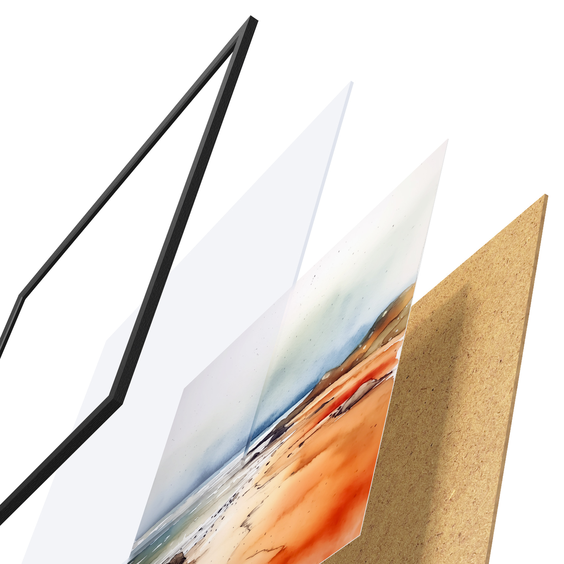De poster bestaat uit een frame, plexiglas, geprinte afbeelding en spaanplaat achterkant. De poster kan meteen aan de muur worden gehangen dankzij de bevestigingen op de achterkant.