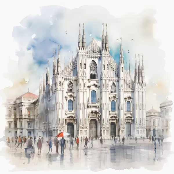 Poster Milaan Duomo, architectuur, stad, regen, aquarel, blauw, grijs, wandelende mensen Nr f38938