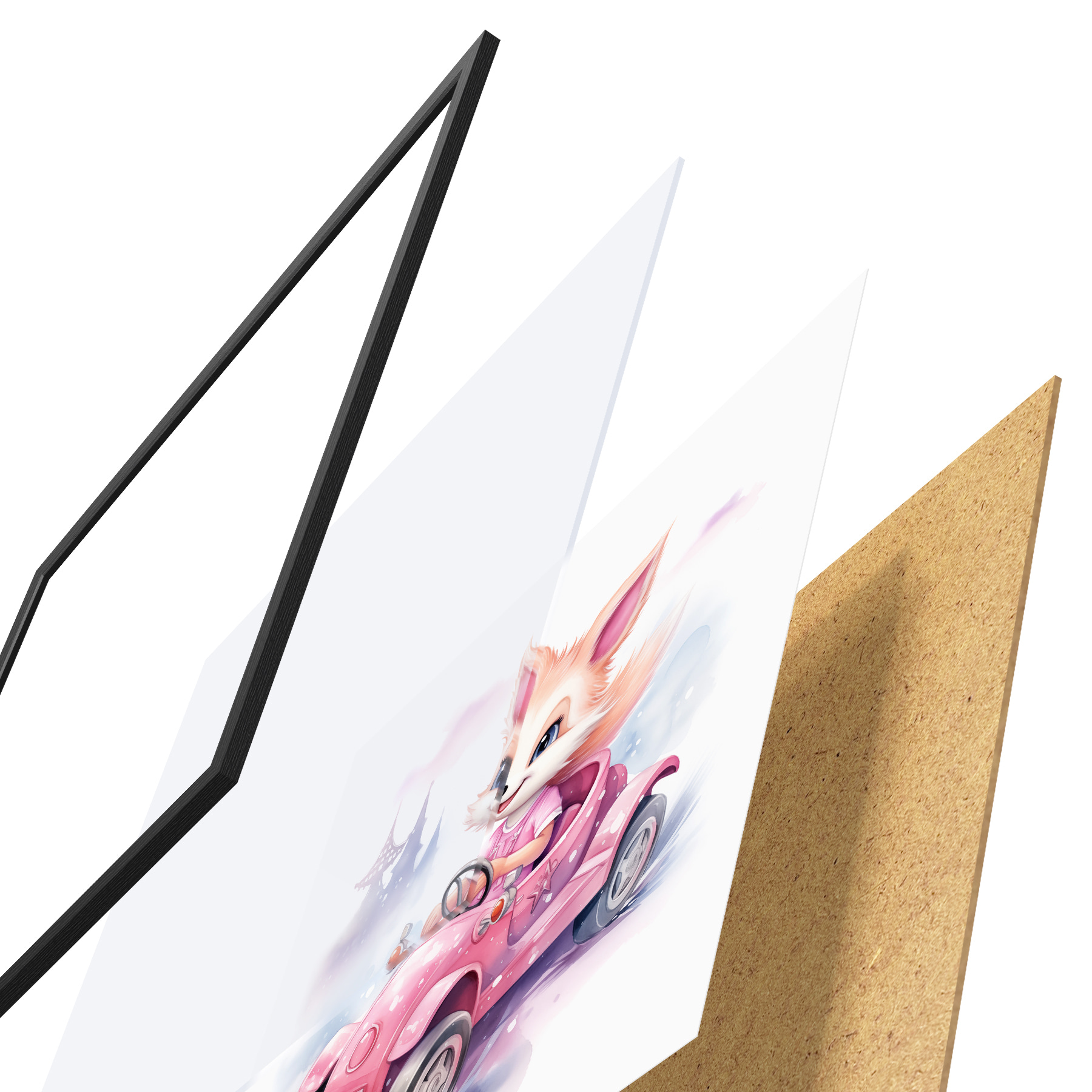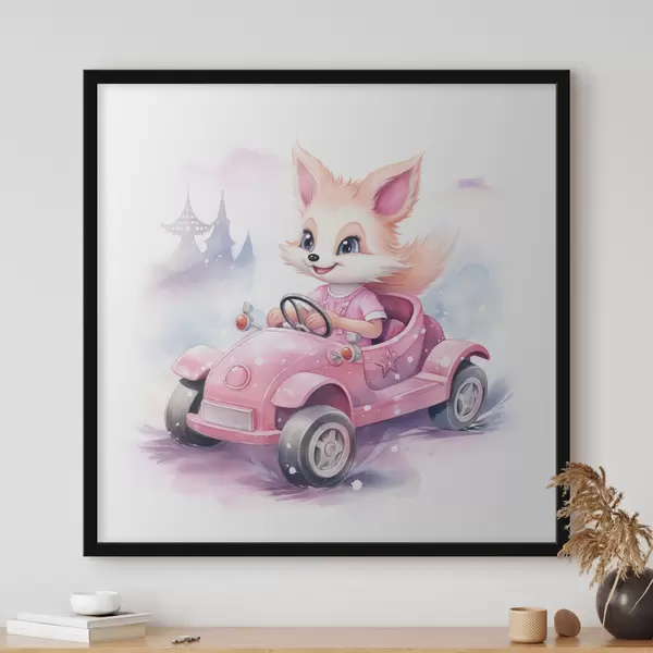 Poster De kleine vos rijdt in een roze auto. Aquarel illustratie voor kinderen f38943