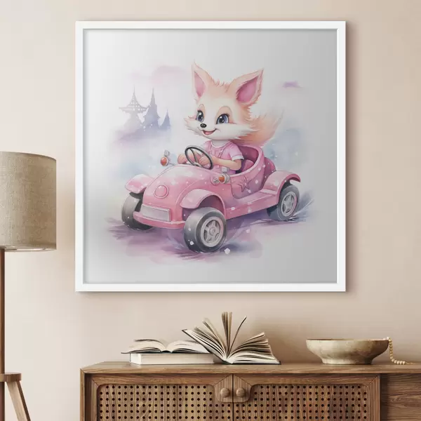 Poster De kleine vos rijdt in een roze auto. Aquarel illustratie voor kinderen f38943