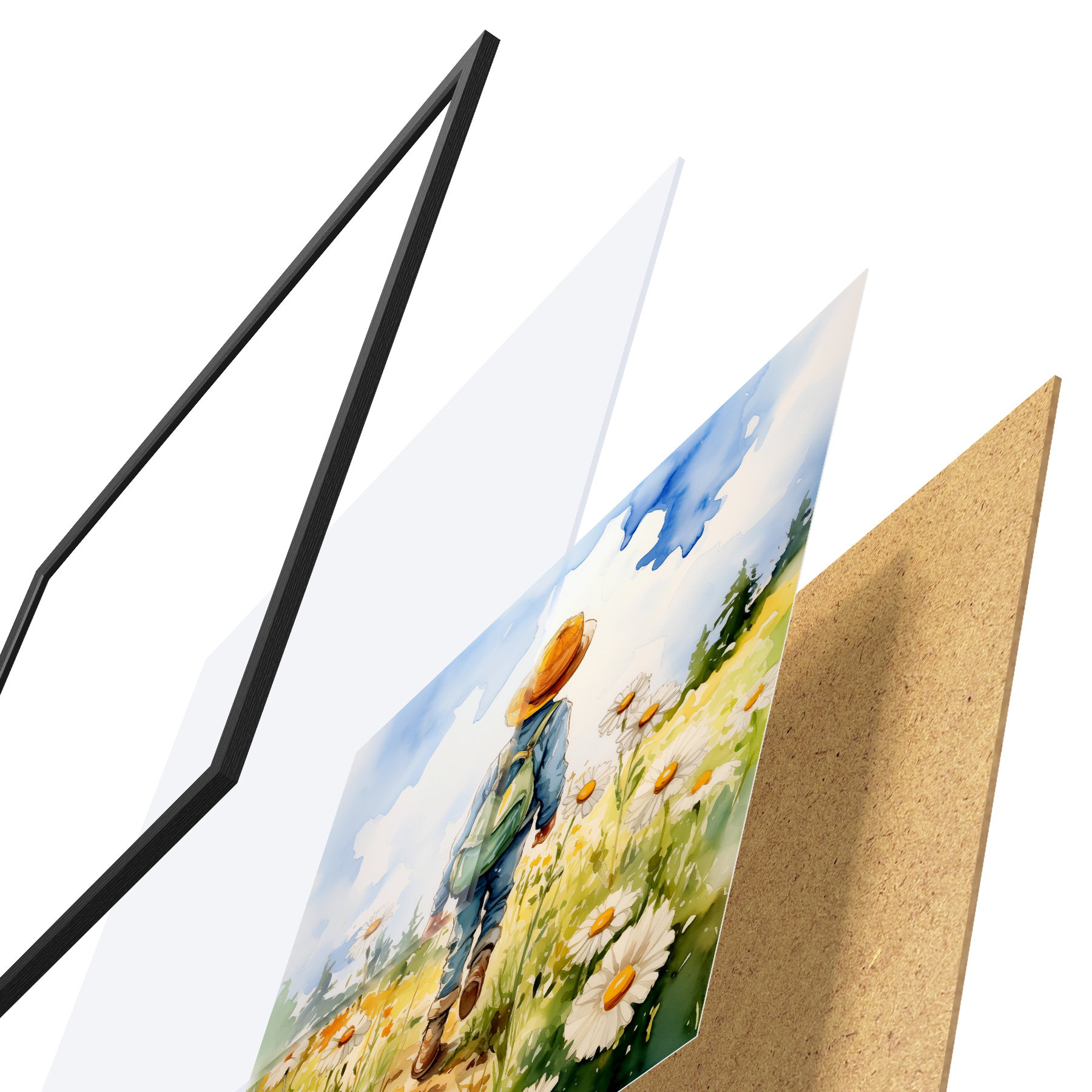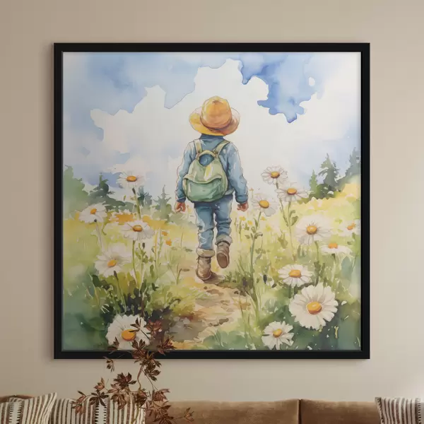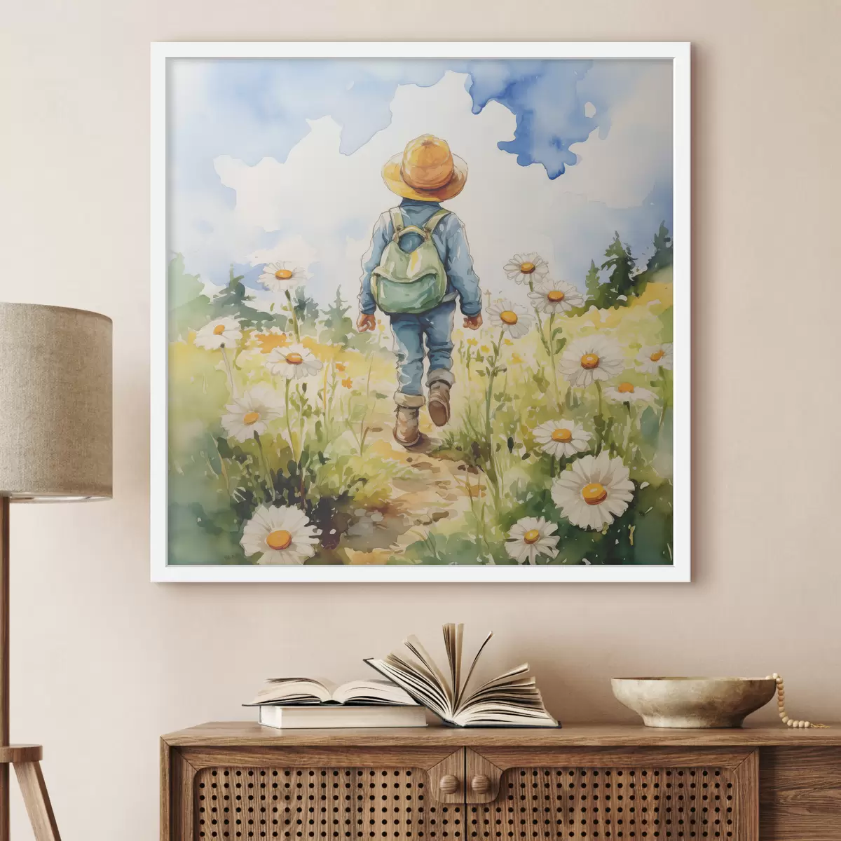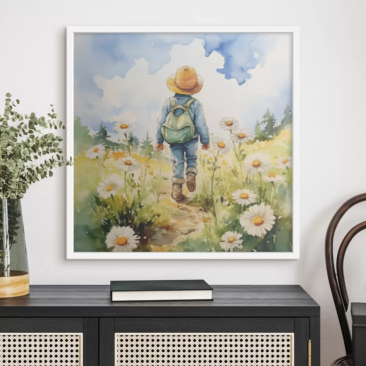 Poster Een jongen met een cowboyhoed met een groene rugzak achter zijn rug en een blauw pak loopt langs een pad in een kamilleveld, aquarel Nr f38946
