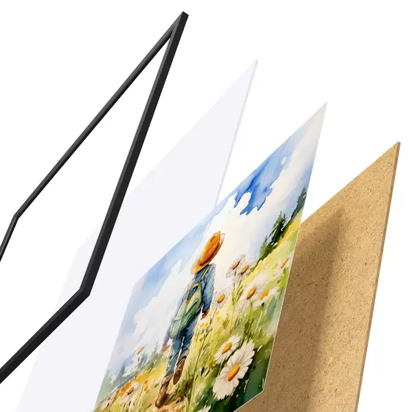 De poster bestaat uit een frame, plexiglas, geprinte afbeelding en spaanplaat achterkant. De poster kan meteen aan de muur worden gehangen dankzij de bevestigingen op de achterkant.