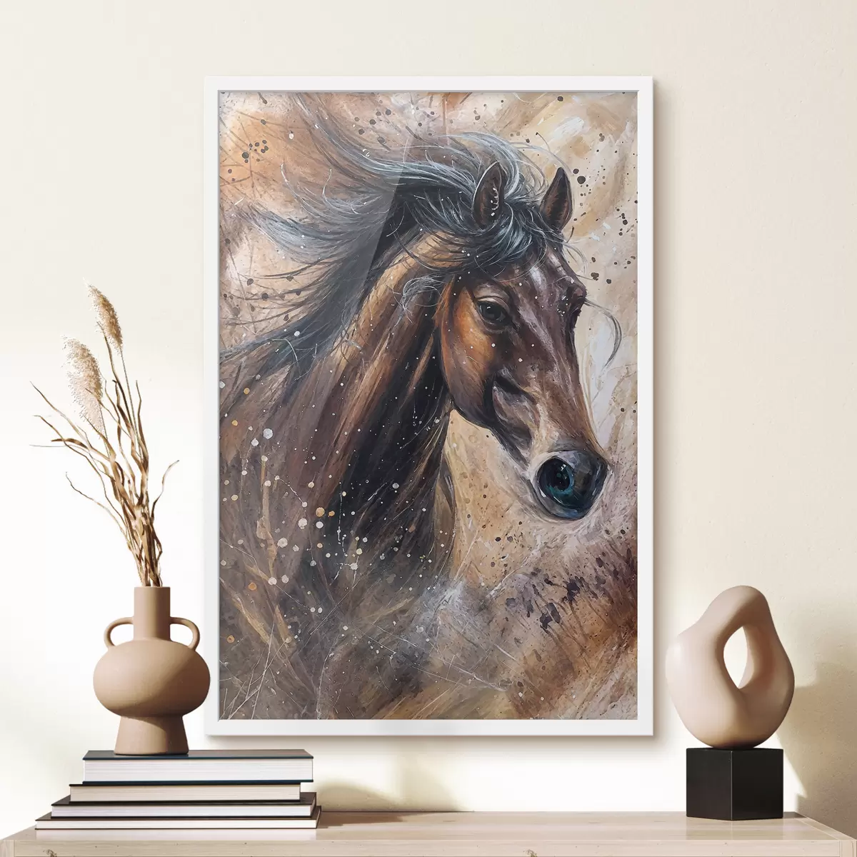 Poster Schilderij van een bruin paard met golvende manen, tegen een gestructureerde achtergrond met kleuraccenten Nr f38959