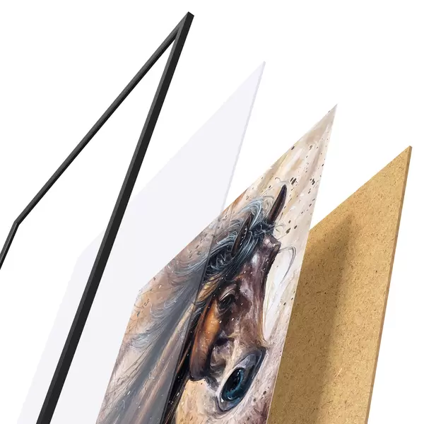 De poster bestaat uit een frame, plexiglas, geprinte afbeelding en spaanplaat achterkant. De poster kan meteen aan de muur worden gehangen dankzij de bevestigingen op de achterkant.