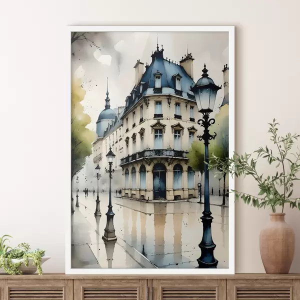 Poster Waterverfschilderij van een historisch gebouw met een gebogen gevel en decoratieve architectonische elementen Nr f38975