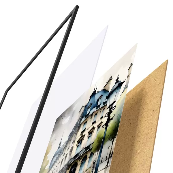 De poster bestaat uit een frame, plexiglas, geprinte afbeelding en spaanplaat achterkant. De poster kan meteen aan de muur worden gehangen dankzij de bevestigingen op de achterkant.