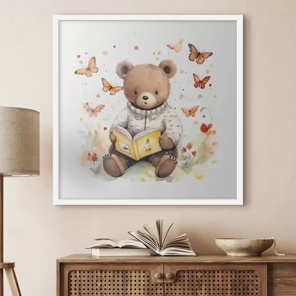 Poster Een bruine beer in een trui leest een boek omringd door waterverf vlinders Nr f39025