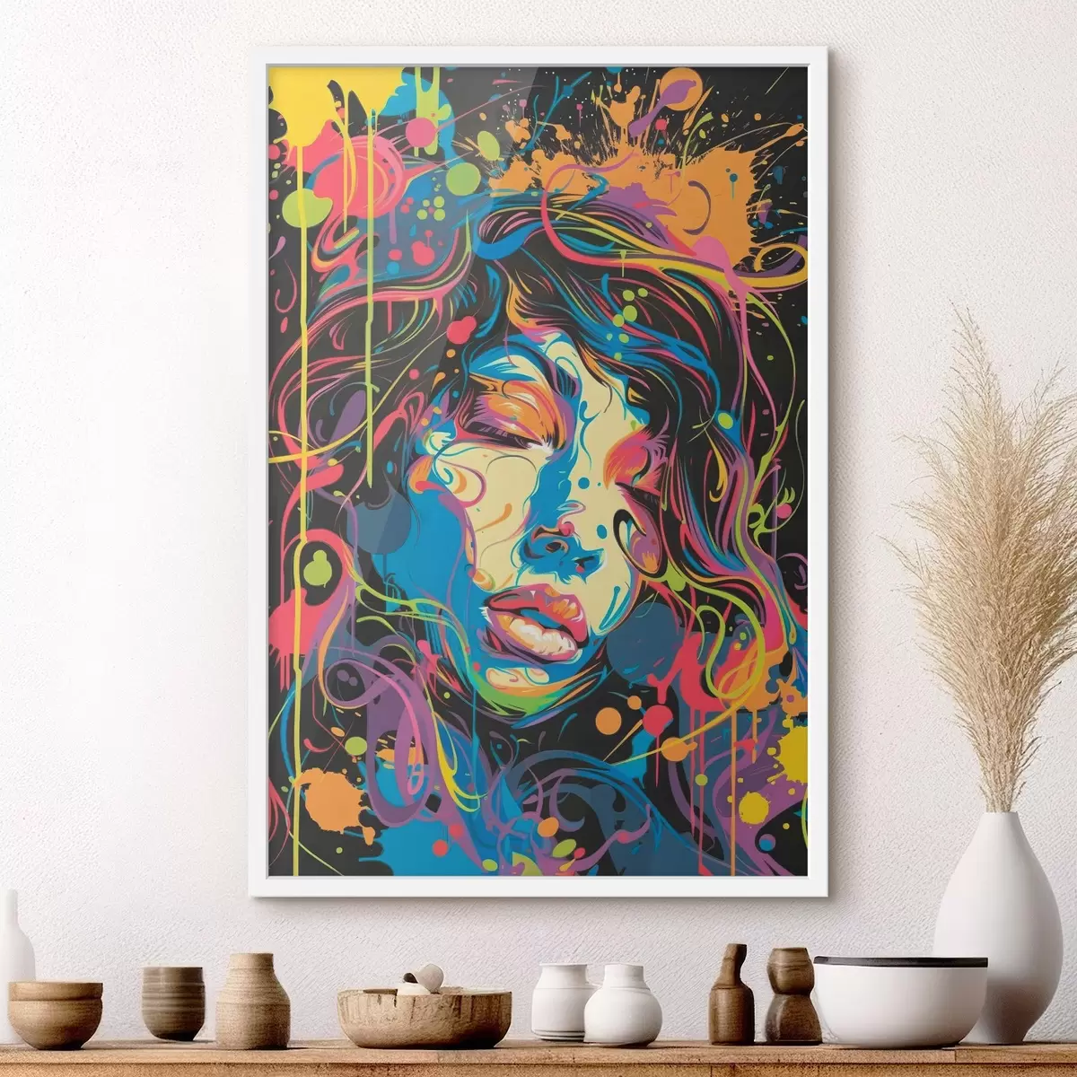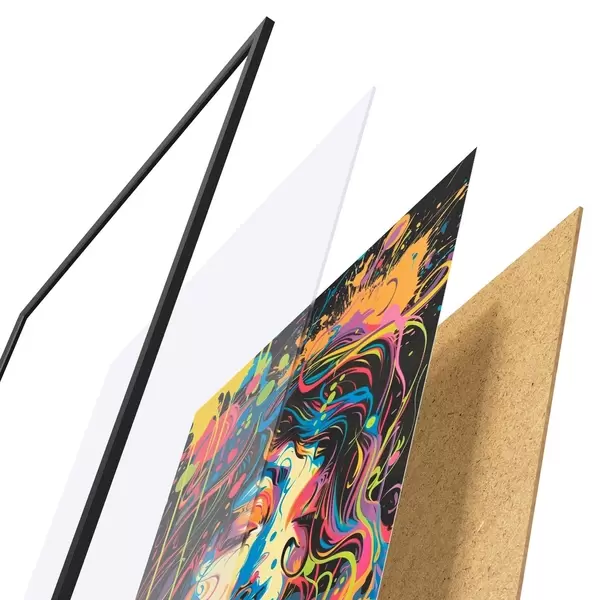 De poster bestaat uit een frame, plexiglas, geprinte afbeelding en spaanplaat achterkant. De poster kan meteen aan de muur worden gehangen dankzij de bevestigingen op de achterkant.