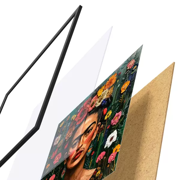 De poster bestaat uit een frame, plexiglas, geprinte afbeelding en spaanplaat achterkant. De poster kan meteen aan de muur worden gehangen dankzij de bevestigingen op de achterkant.