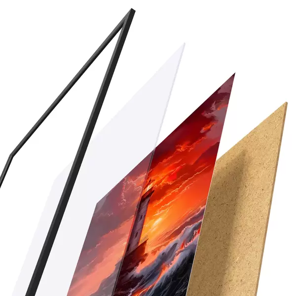 De poster bestaat uit een frame, plexiglas, geprinte afbeelding en spaanplaat achterkant. De poster kan meteen aan de muur worden gehangen dankzij de bevestigingen op de achterkant.