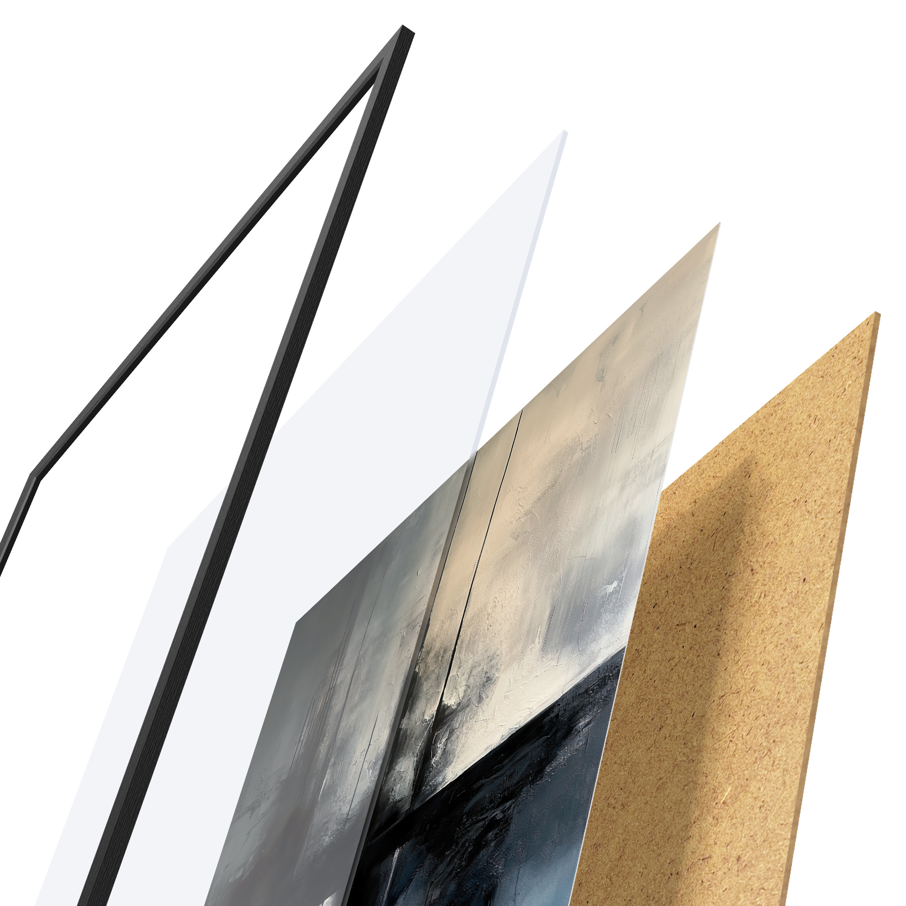 De poster bestaat uit een frame, plexiglas, geprinte afbeelding en spaanplaat achterkant. De poster kan meteen aan de muur worden gehangen dankzij de bevestigingen op de achterkant.