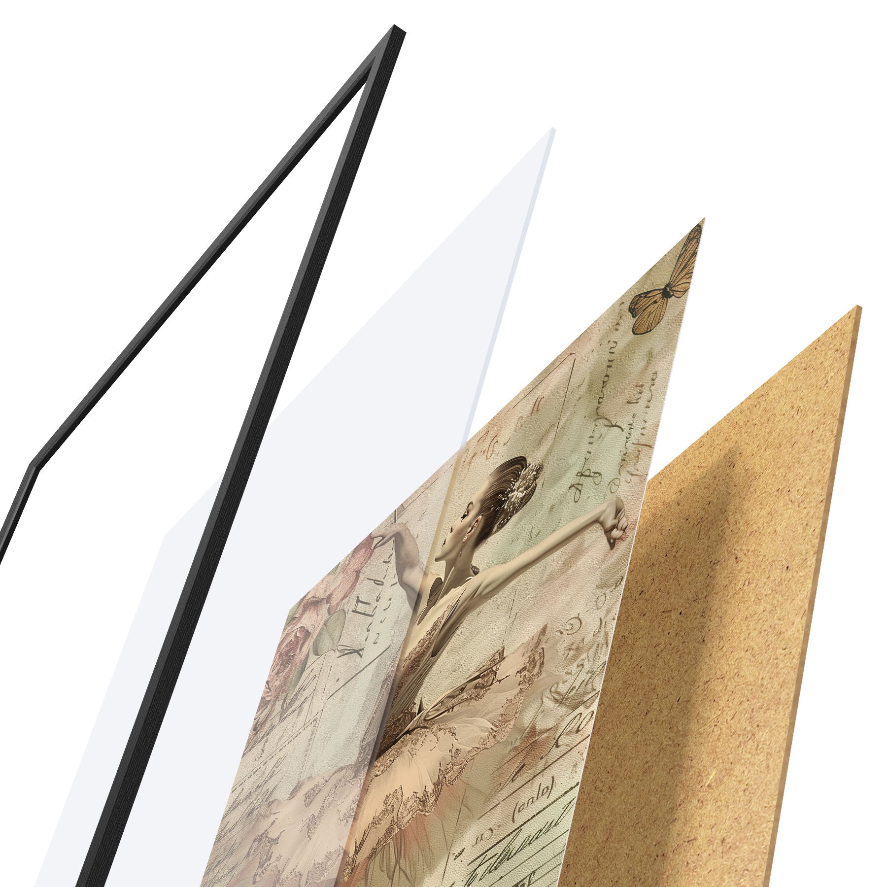 De poster bestaat uit een frame, plexiglas, geprinte afbeelding en spaanplaat achterkant. De poster kan meteen aan de muur worden gehangen dankzij de bevestigingen op de achterkant.