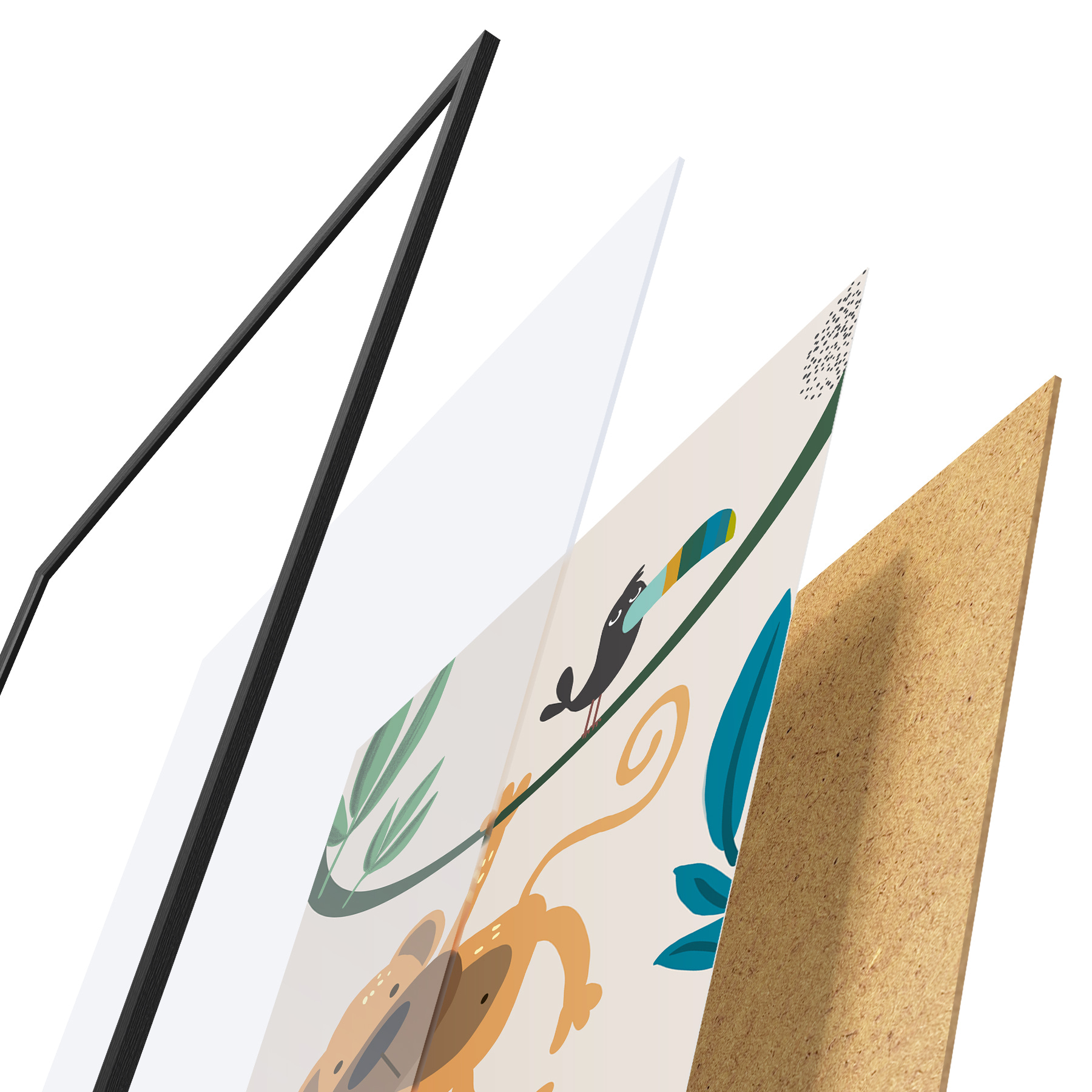 De poster bestaat uit een frame, plexiglas, geprinte afbeelding en spaanplaat achterkant. De poster kan meteen aan de muur worden gehangen dankzij de bevestigingen op de achterkant.