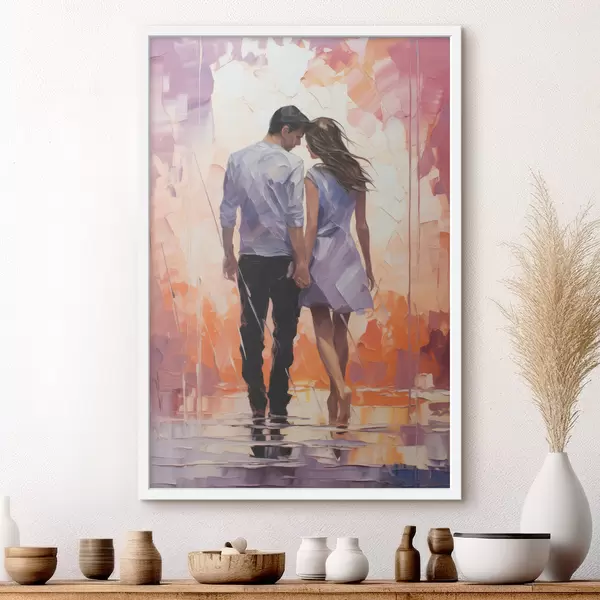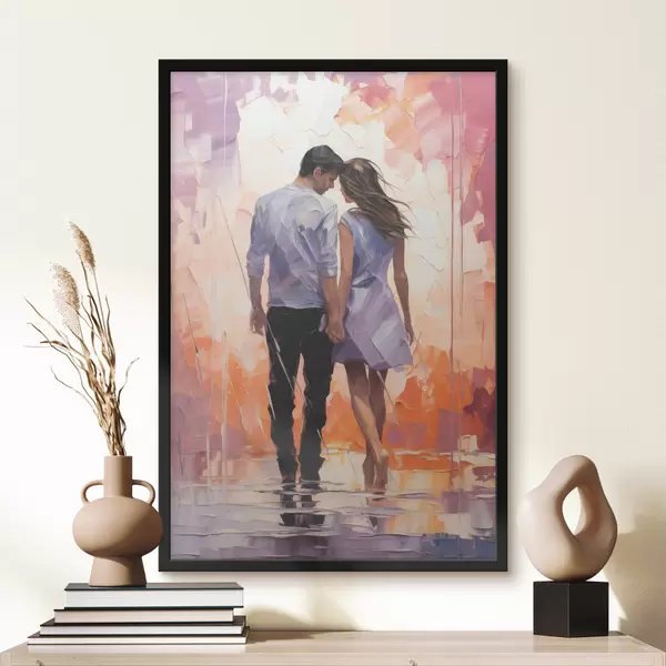 Poster Silhouet van een verliefd stel abstract schilderij, meisje en jongen, roze, oranje, paarse, zwarte kleur f39124